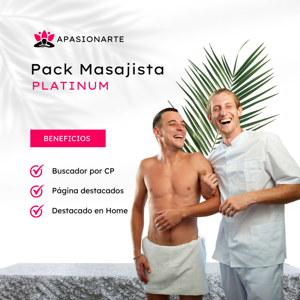 Conviértete en el masajista más visible de nuestra plataforma. El Pack Masajista Platinum te ofrece el máximo nivel de exposición, con apariciones destacadas tanto en nuestra página principal de masajistas como en la sección de destacados de la página de inicio. Este plan está pensado para los profesionales que buscan consolidar su marca y llegar a más clientes de forma constante.